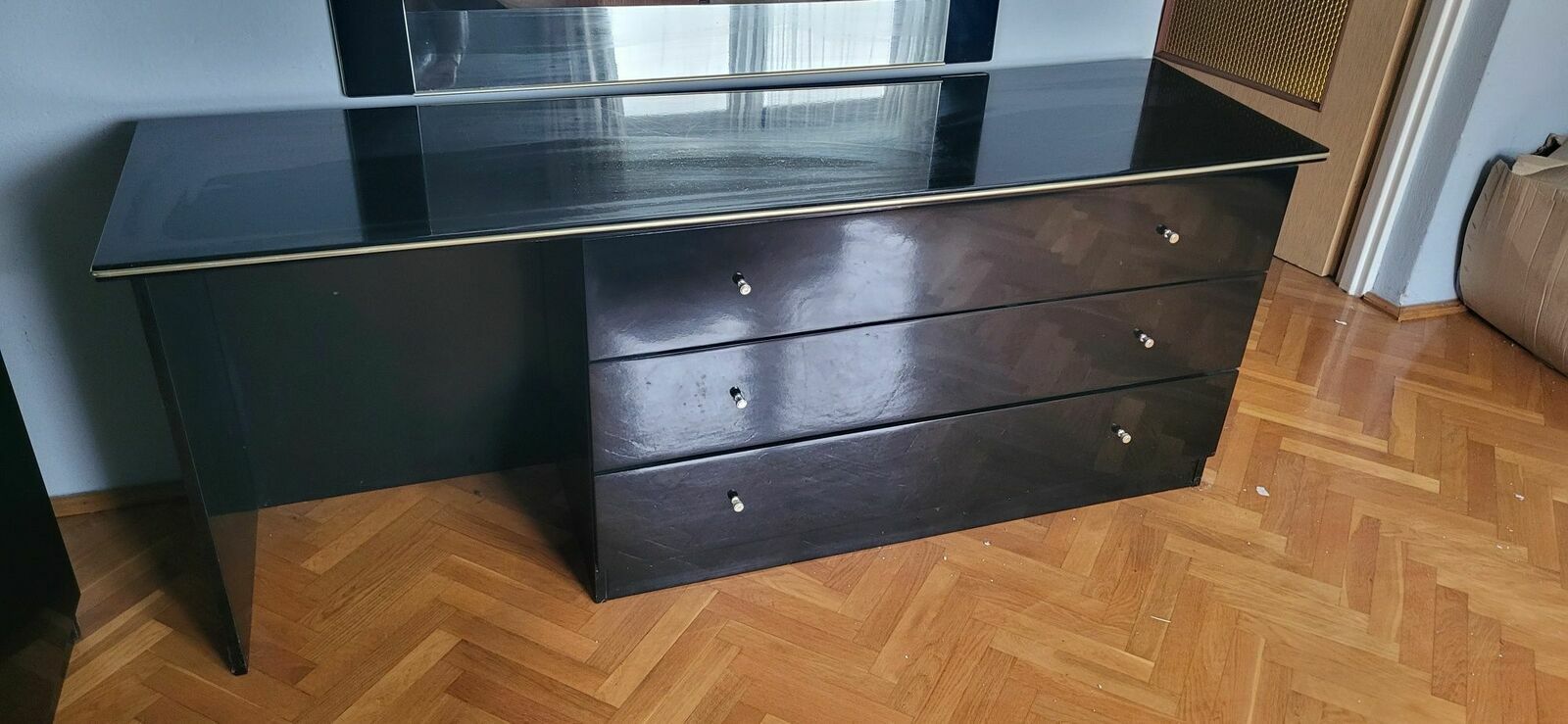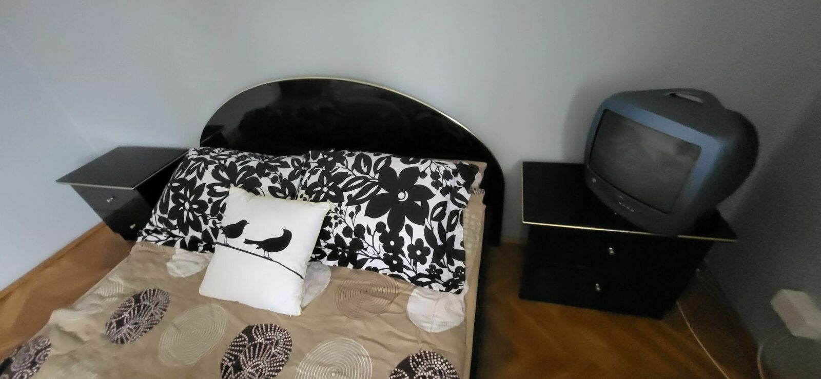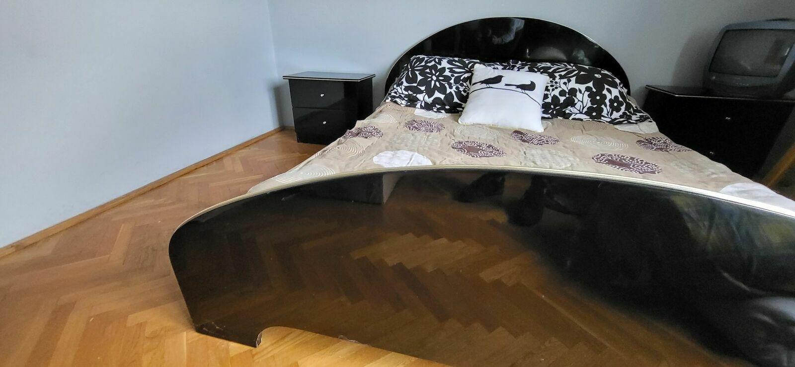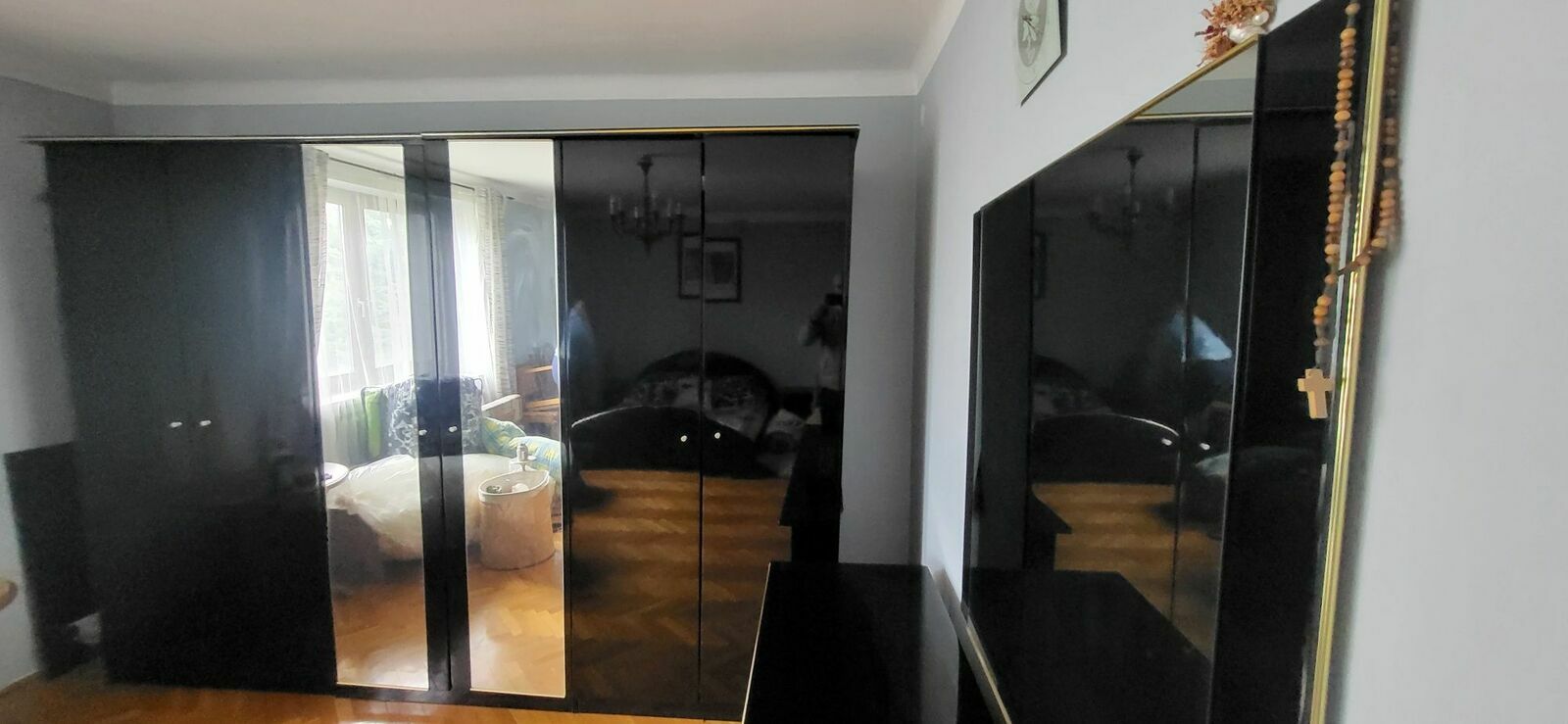 Solidne łóżko o wymiarach 160 cm wraz z 2 szafkami nocnymi. Dużą porządną szafą oraz komodą z lustremMebel w dobrym stanie, używany, ale wciąż w pełni funkcjonalny.
